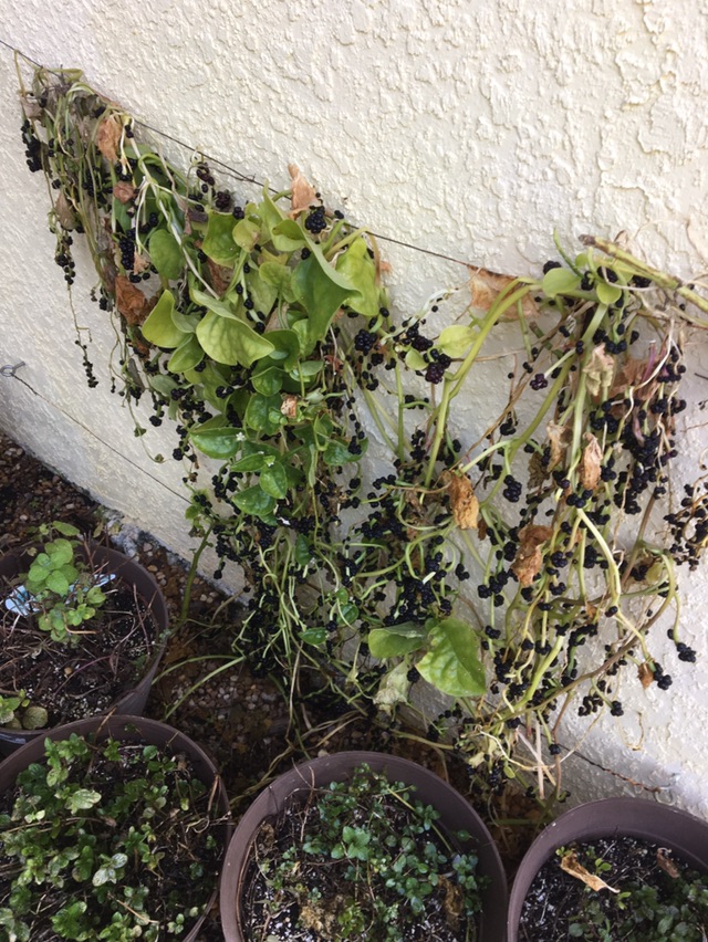 While this looks bad, it has a purpose: saving Malabar Spinach seed. The plants are left so that the seeds will mature and dry on the vine. I have tried several ways to save this seed and this is by far the easiest. Only downfall of saving seed in this manner is that the birds eat the berries and then poop it all over the yard (where it grows as a volunteer). After trying to harvest seed several times when the berry is not completely dry on the vine all I receive is lovely, purple-stained hands.